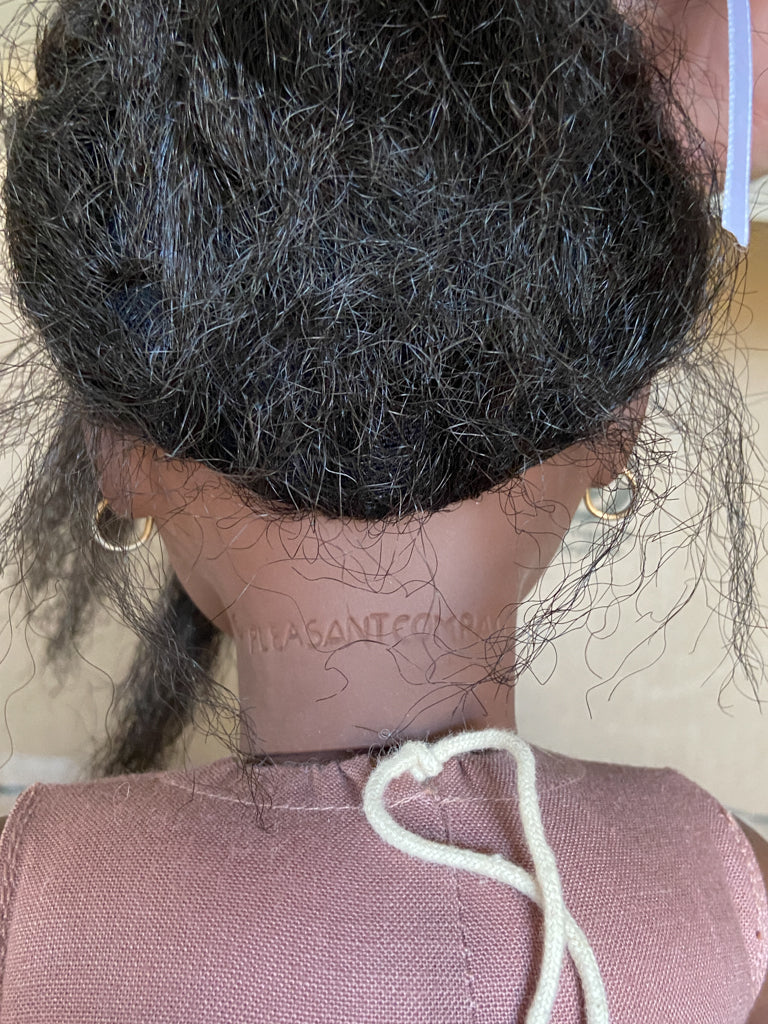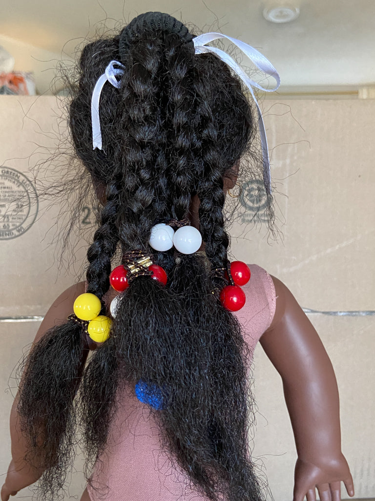 Pleasant Company to Mattel transitional Addy doll. I'm gonna guess that her hair will be thin when the braids are taken out. Please see all pics. I have no idea why her feet are discolored on the bottom.