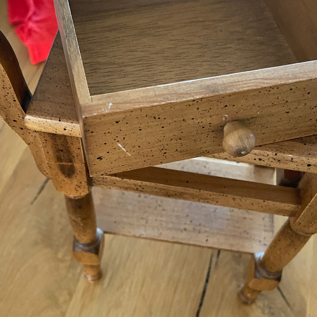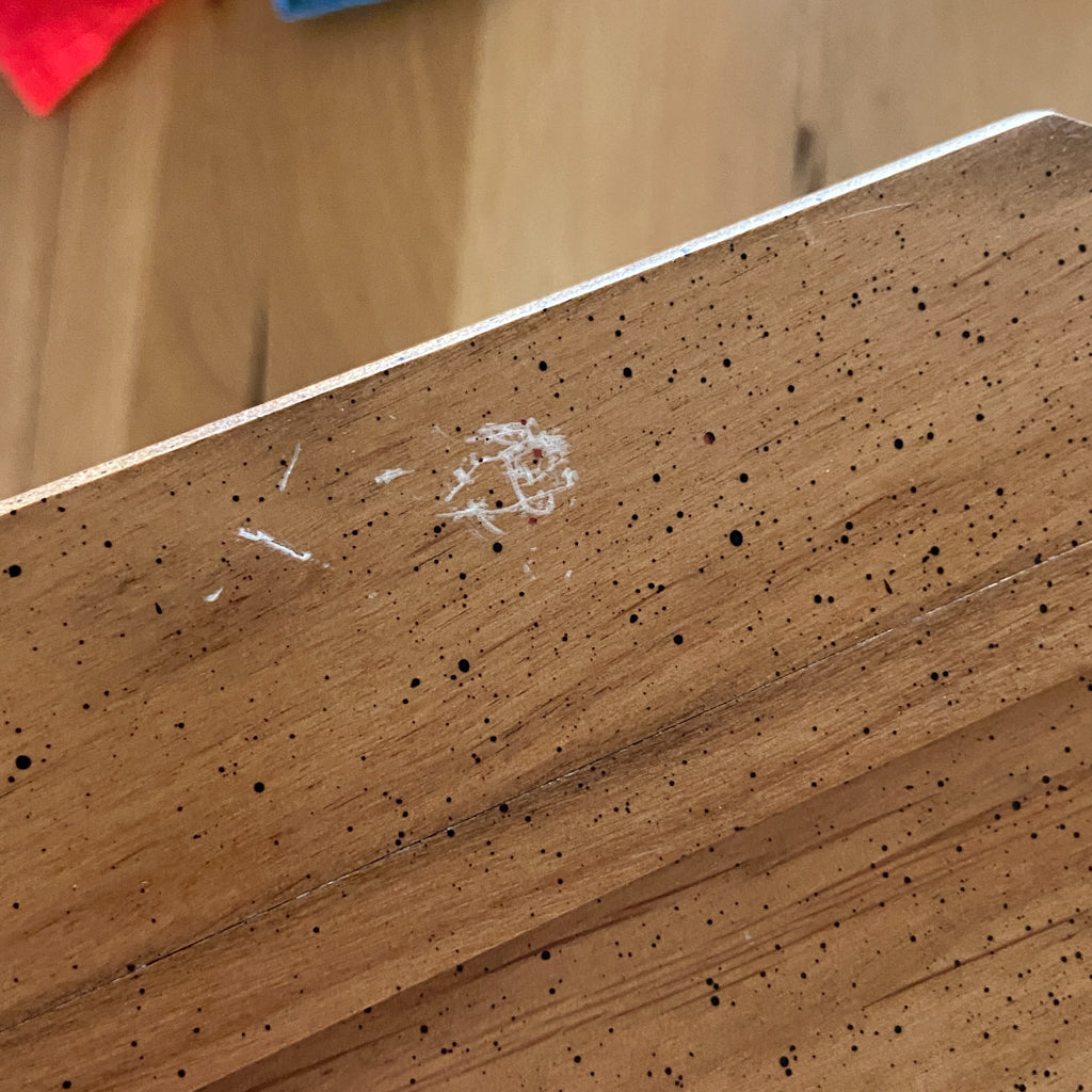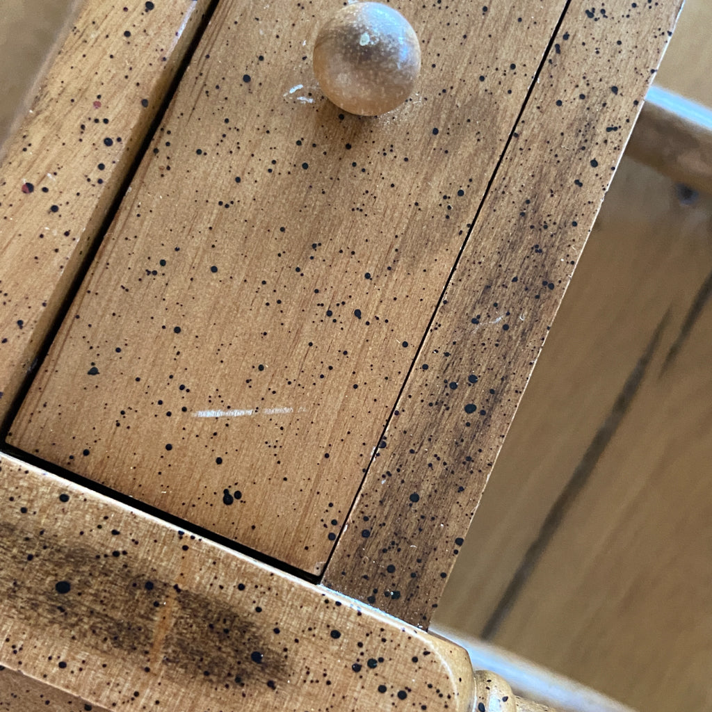 Knob comes loose, but it stays in place for display. Please see scratches and rubs that are super common with Addy's furniture.