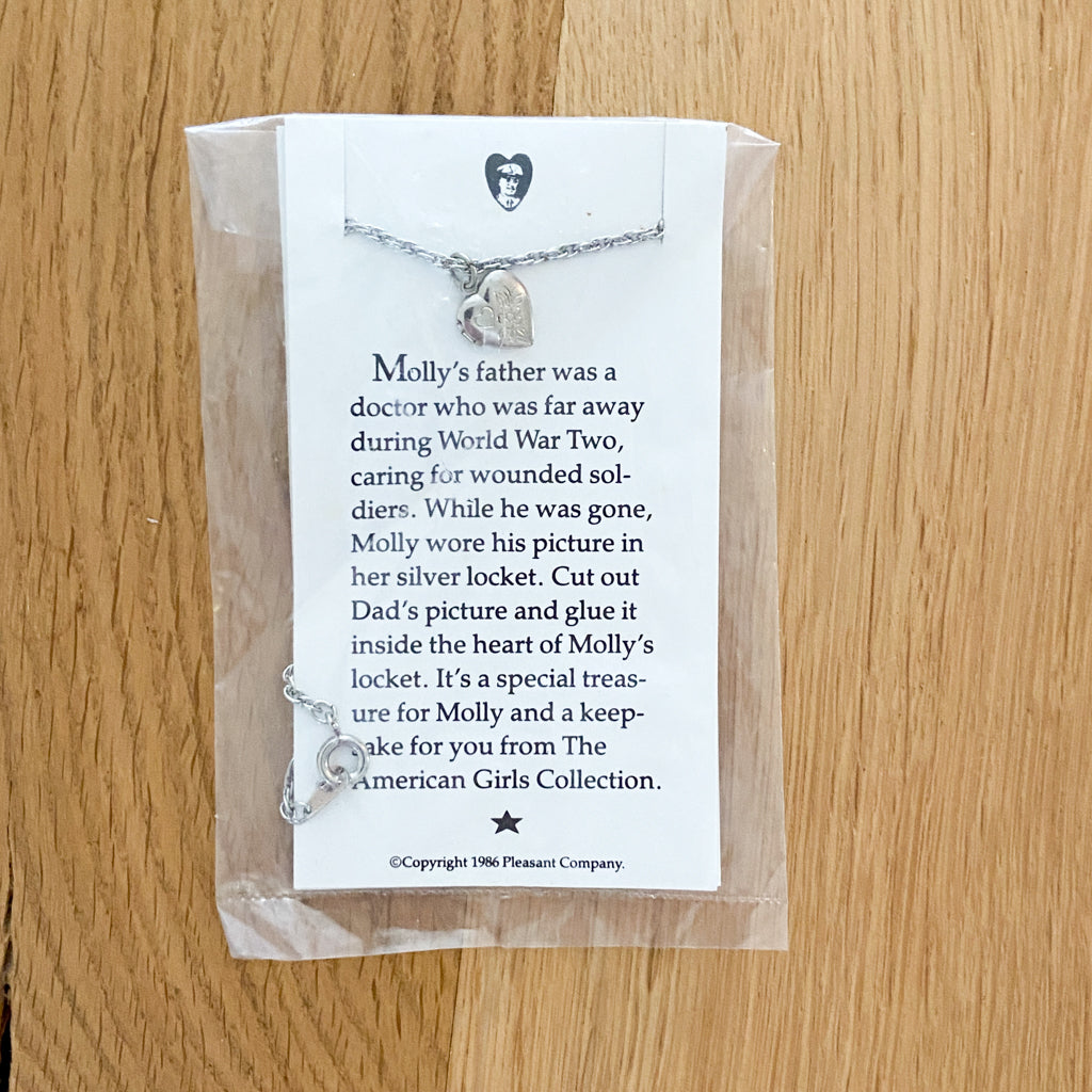 This is the first version of Molly's locket and is appropriate for a 1986 doll through the early 90's. It's unused in the original packaging. I think this is a late 80's or early 90's one, based on the plastic bag, but the locket is exactly the same as the 1986 ones. It's pretty much untarnished because it's been in the bag all these years.