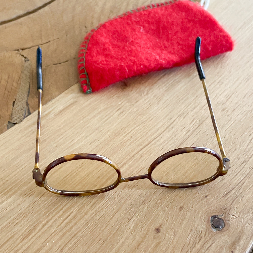 All of the glasses cases in this batch of listings were mixed up and I made my best guess of which to pair together. There is a chance this glasses case isn't original, hence the lower price. Lenses have slight yellowing which is very common with this item.