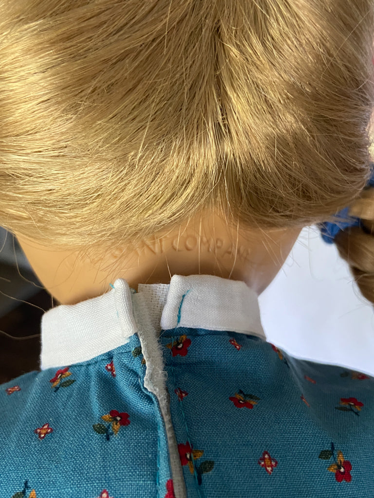 She has the original gold Made in West Germany "hand" sticker. It is on the cuff of her dress and I don't know if it was done at the factory or by her original owner, considering the doll is untouched otherwise.
